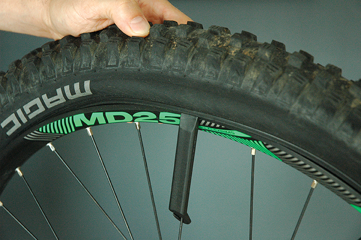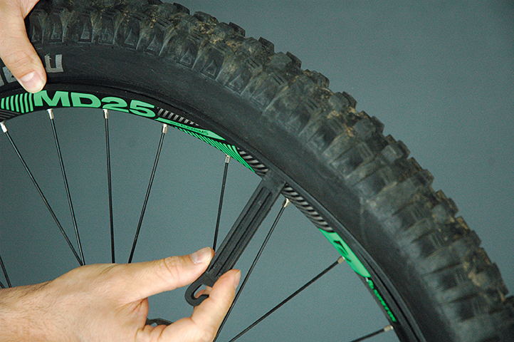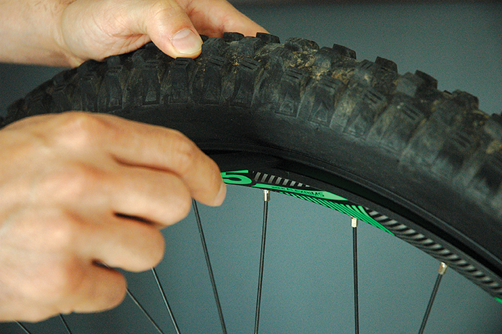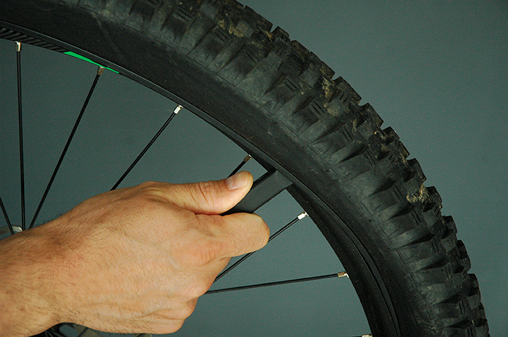 Αρχικά αφαιρέστε τον τροχό από το ποδήλατο. Κατόπιν, πιέστε τα πλαϊνά του ελαστικού με τα δάχτυλα –σε όλο του το μήκος– για να ξεκολλήσει από τα τοιχώματα του στεφανιού (βλ. φωτό ). Στη συνέχεια, τοποθετήστε το ένα από τα δυο ειδικά λεβιεδάκια μέσα στην πλαϊνή επιφάνεια του ελαστικού (βλ. φωτό) – στην απέναντι μεριά από την βαλβίδα – πιέστε το προς τα κάτω για να φέρει το ελαστικό έξω από το στεφάνι και κλειδώστε το στην ακτίνα του τροχού (βλ. φωτό). Μετά, τοποθετήστε το δεύτερο ειδικό λεβιεδάκι με παρόμοιο τρόπο λίγα εκατοστά δίπλα από το άλλο, πιέστε το προς τα κάτω για να φέρει το ελαστικό έξω από το στεφάνι και χωρίς να τo κλειδώσετε στις ακτίνες, σύρτε το με δύναμη δεξιόστροφα πάνω στο στεφάνι μέχρι να αφαιρεθούν τα πλαϊνά του ελαστικού από αυτό (βλ. φωτό).