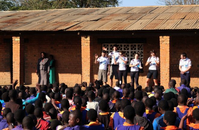 Έχουν σταθεί σε ψηλό σκαλί απέναντι απ’ τους Μαλαουιανούς μαθητές, όλοι χαμογελαστοί, τραγουδούν κουνώντας τα χέρια ψηλά και χαιρετούν το πλήθος των παιδιών.