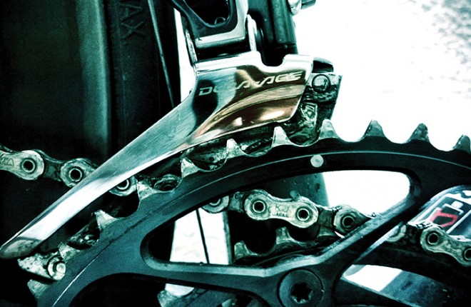 2. H δεύτερη κίνηση είναι να ρυθμίσετε σωστά τα όρια τoυ σασμάν. Η ρύθμιση πρέπει να γίνει με την αλυσίδα στη μετάδοση. Τα όρια ρυθμίζονται από τις δύο μικρές βίδες που βρίσκονται στο πάνω μέρος του σασμάν (βλέπε φωτο). Σε κάποια σασμάν – όπως στο DuraAce 9000 της φωτογραφίας – οι βίδες δεν ορίζονται με τα αρχικά γράμματα L και H. Η βίδα με το αρχικό L είναι αυτή που βρίσκεται εσωτερικά προς το seat tube. Αρχικά επιλέγουμε την πιο ελαφριά ταχύτητα στο οπίσθιο σασμάν. Aνάλογα με τη θέση που βρίσκεται το εμπρόσθιο σασμάν, βιδώνουμε ή ξεβιδώνουμε την βίδα με το αρχικό L μέχρι το εσωτερικό της γλίστρας του σασμάν να έρθει σε απόσταση του ενός χιλιοστού από την αλυσίδα (βλέπε φωτο). Μετά ξεβιδώνουμε αρκετά την βίδα με το αρχικό H, για να μπορεί στη συνέχεια να ανέβει η αλυσίδα στο μεγάλο δίσκο.