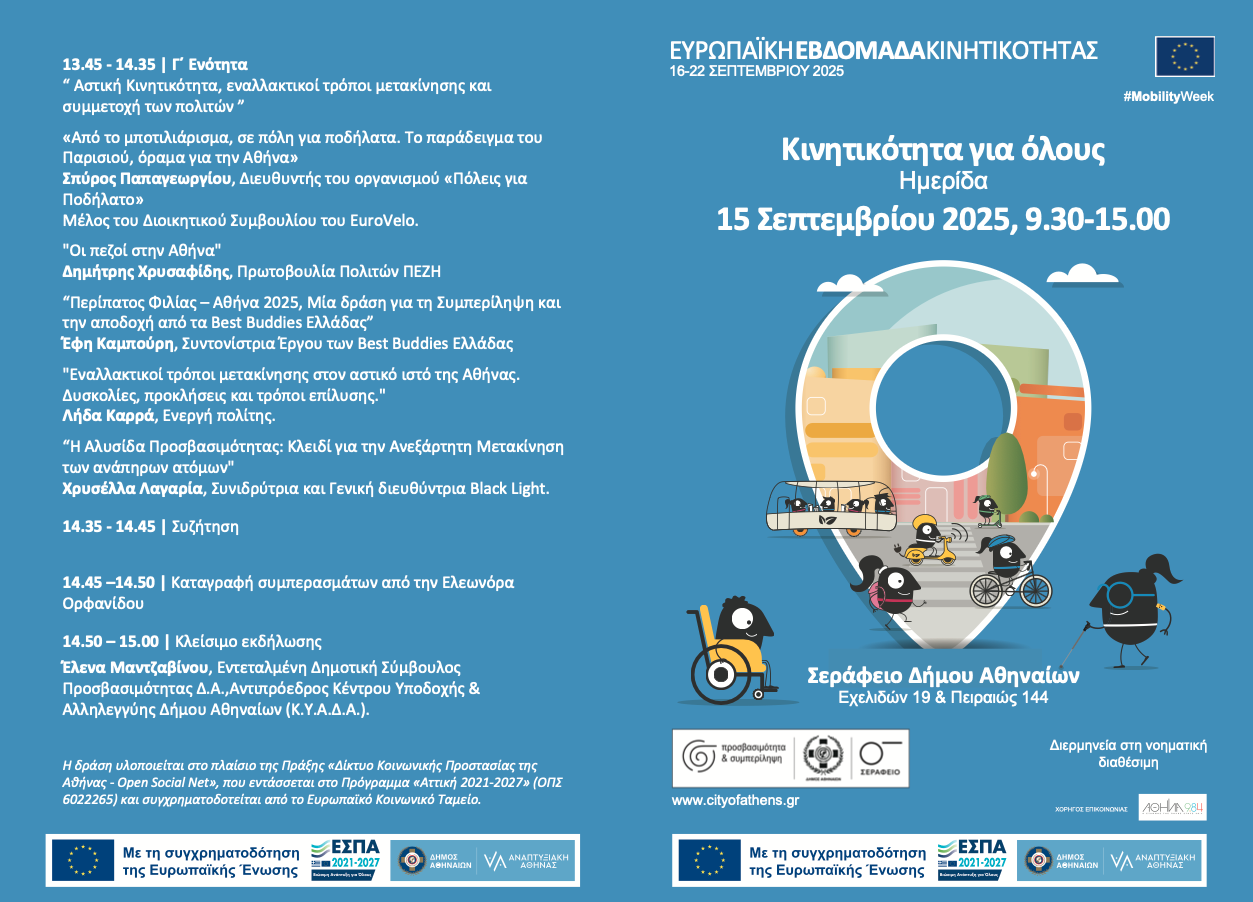 Με αφορμή την έναρξη της Ευρωπαϊκής Εβδομάδας Κινητικότητας, ο Δήμος Αθηναίων, διοργανώνει στο Σεράφειο ημερίδα με τίτλο «Κινητικότητα για Όλους»