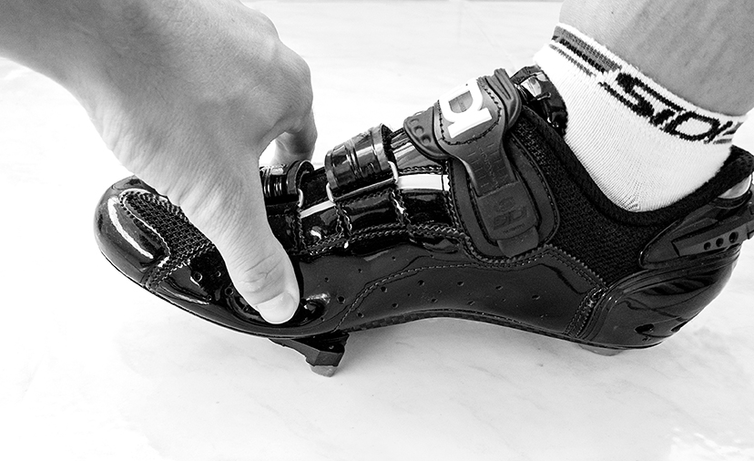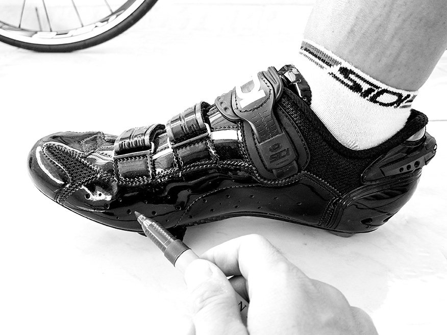 Η απόδοση, η δύναμη και η αποφυγή τραυματισμών, σχετίζονται άμεσα με τη θέση που φέρουν τα πόδια μας στα πετάλια. Υπάρχουν πολλές θεωρίες σχετικά με τη σωστή θέση των ποδιών επάνω στα πετάλια.1. Φορώντας το παπούτσι, σταθείτε όρθιοι και προσπαθήστε να εντοπίσετε με το χέρι σας (ή με την βοήθεια κάποιου άλλου) το κόκαλο που προεξέχει στο εσωτερικό του ποδιού σας, κουνώντας τα δάχτυλα του ποδιού. Μόλις το εντοπίσετε, σημαδεύετε την ακριβή του θέση στο εξωτερικό του παπουτσιού, με ένα μαρκαδόρο, τραβώντας μια γραμμή μέχρι τη σόλα του.