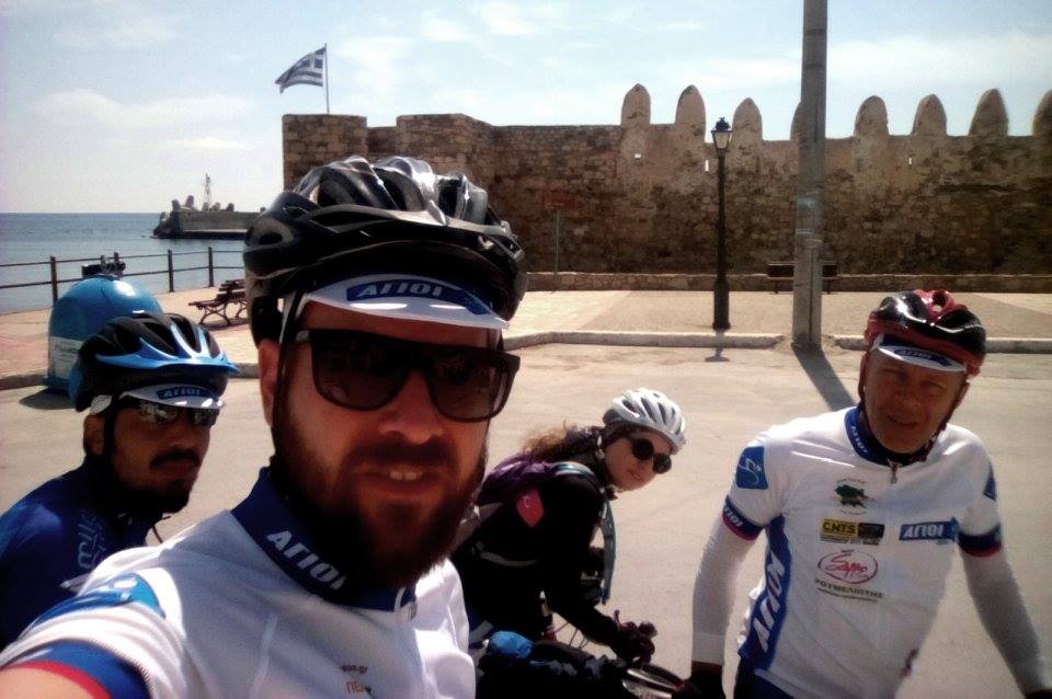Εμείς με τις σέλφυς μας. Και η αγωνία των επερχόμενων δύσκολων χιλιομέτρων να πνίγεται στην ηδονή της παραδεισένιας αμμουδερής παραλίας στα Τέρτσα, με την θάλασσα σε κατάσταση νιρβάνα, με λιγοστούς ξένους τουρίστες που απολάμβαναν τον ήλιο και το βιβλίο τους, γατούλες αδέσποτες (λες κι οι γάτες δεσπόζονται ποτές!), ένα αεικίνητο κουτάβι να γυροφέρνει τα κουμπωτά μου παπούτσια που είχα πετάξει κάπου κάτω απ’ το τραπέζι, ο μαγαζάτορας να μας τρατάρει τα καλούδια και τα κρητικά εδέσματα, κι εμείς νωχελικά να αποφορτίζουμε το άγχος και την κούρασή μας, στα κρυστάλλινα νερά. Ο σύντροχος Μανώλης μας είχε προειδοποιήσει: η ανάβαση είναι αλύπητη και ξεκινάει απ’ τα πρώτα 100 μέτρα!