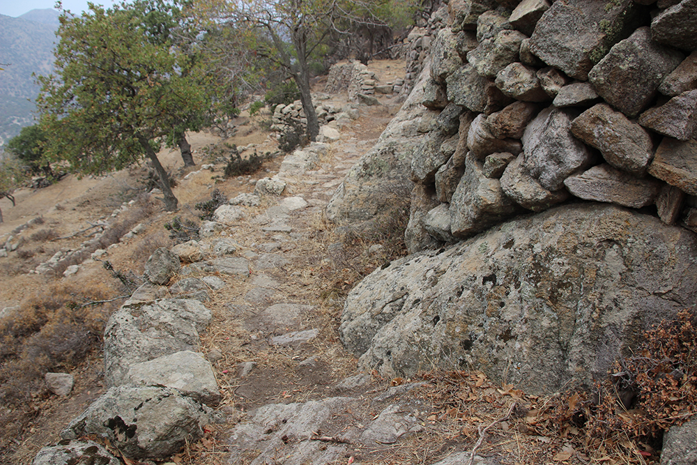 Αυτόν ακολούθησα την 3η μέρα, προσπερνώντας στα γρήγορα τους κρατήρες. Λίγο πριν το Μανδράκι υπάρχουν δύο μονοπάτια που χρειάστηκε ιδιαίτερη προσοχή για να μην τα προσπεράσω. Το ένα ανεβοκατεβαίνει ελαφρά παράλληλα με το χωματόδρομο ενώ το άλλο ξεκινάει από τα όρια του οικισμού, είναι στρωμένο με στρογγυλεμένες ηφαιστειακές πέτρες και έχει μαντρότοιχο στα αριστερά και τα δεξιά.