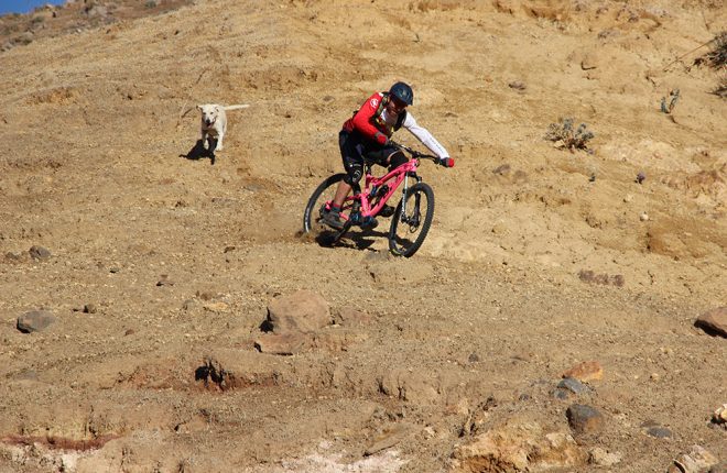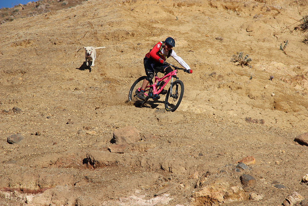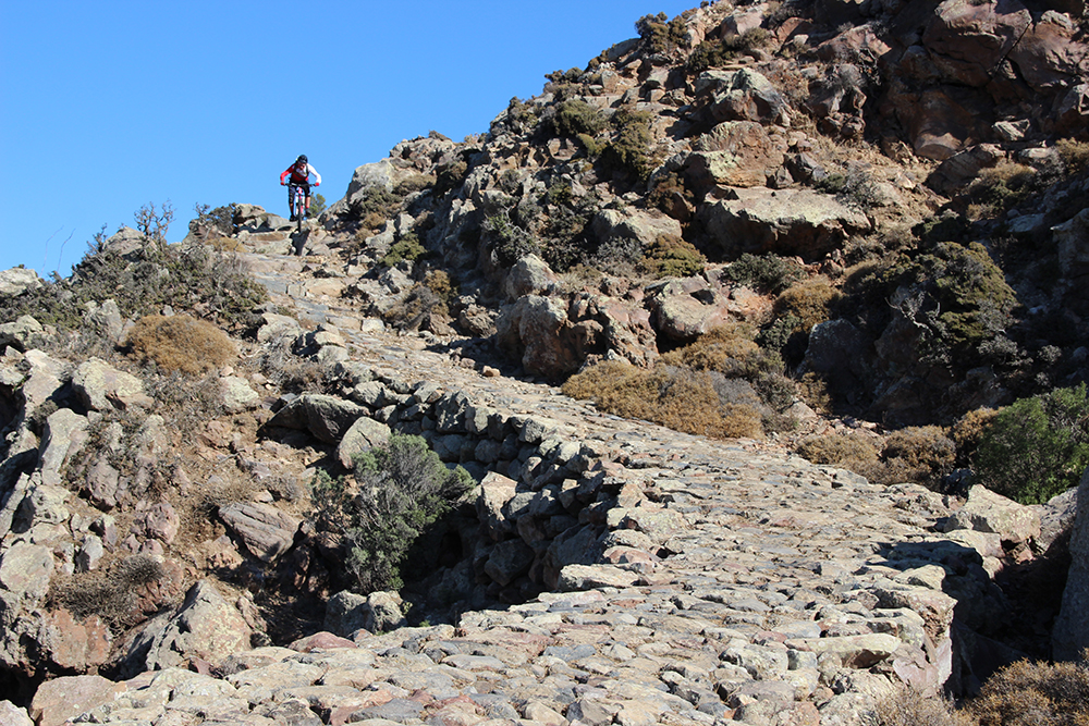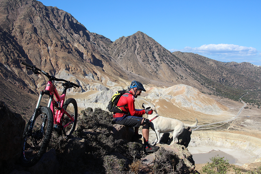 Τη 2η μέρα έμεινα μέσα στην Καλντέρα, έσπρωξα το ποδήλατο σε κάθε πιθανή πλαγιά και από εκεί απελευθέρωσα τα φρένα και άφησα την βαρύτητα να κάνει τη δουλειά της. Το χώμα εκεί είναι μαλακό, οι επιλογές για «γραμμή» κατάβασης είναι απεριόριστες! Σε κάθε μέρος που καβαλάω έχω φίλους και γνωστούς. Υπάρχουν συνήθειες που έχω, μονοπάτια που μου αρέσουν και πράγματα που κάνουν το κάθε μέρος μοναδικό. Στη Νίσυρο έχω και έναν τετράποδο φίλο, η Μόμο ευχαριστιέται τις βόλτες όσο κι εγώ.