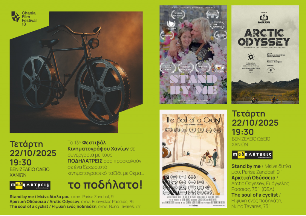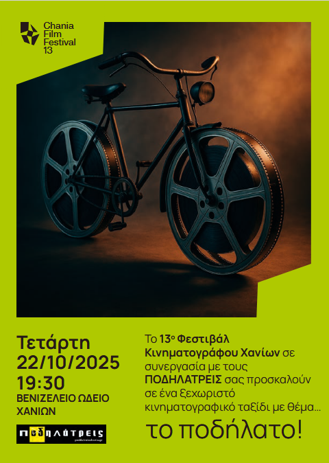 Οι ΠοδηΛάτρεις προσκαλούν όλους τους πολίτες των Χανίων (χρήστες ποδηλάτων ή μη) στις προβολές των τριών (3) ταινιών με θέμα «το Ποδηλάτο» που θα λάβουν χώρα την Τετάρτη 22/10/2025 και ώρες :19:30-22:30 στην κεντρική αίθουσα του Βενιζέλειου Ωδείου. Οι προβολές συνδιοργανώνονται μαζί με το CFF (Κινηματογραφικό Φεστιβάλ Χανίων) στα πλαίσια του 13ου Φεστιβάλ Κινηματογράφου Χανίων.
