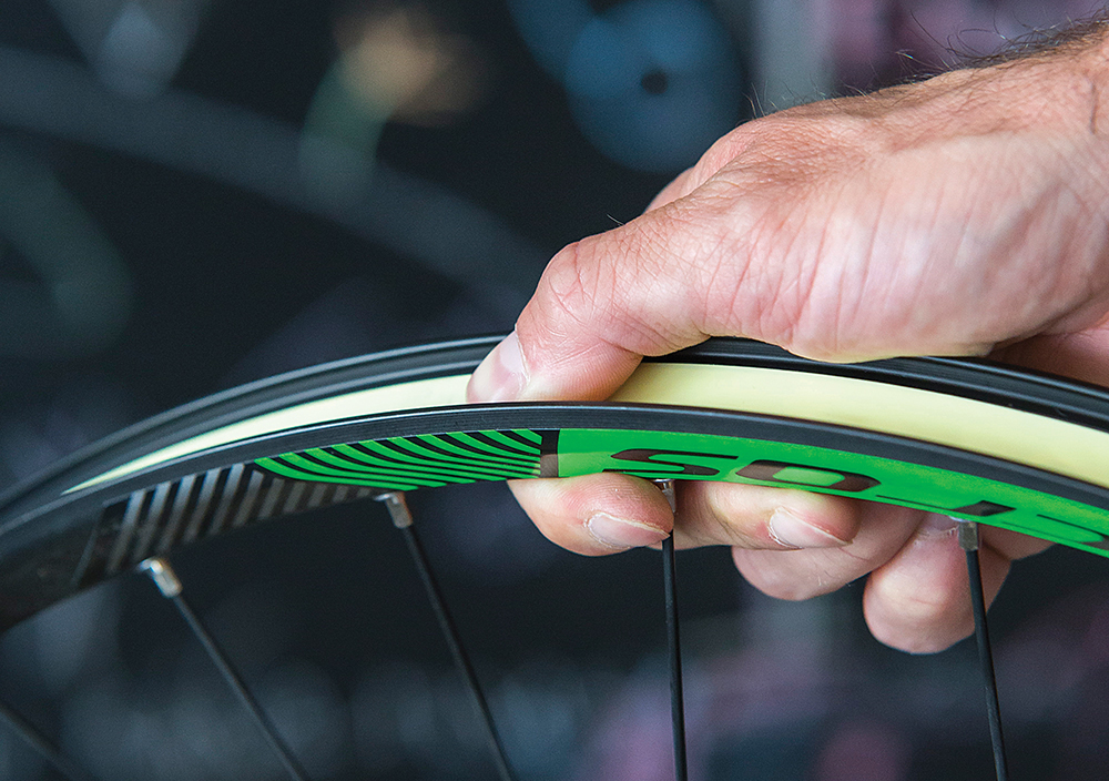 Σε περίπτωση που ο τροχός δεν είναι καινούργιος, θα πρέπει να αφαιρέσετε το ελαστικό, τη σαμπρέλα και το rim strip από αυτόν και να καθαρίστε πολύ καλά την εσωτερική επιφάνεια του στεφανιού με πανάκι και οινόπνευμα (βλέπε φωτό). Στη συνέχεια, ξεκινήστε να κολλάτε την ταινία στο στεφάνι – αρχίζοντας 5 εκατοστά πριν από την τρύπα της βαλβίδας (βλέπε φωτό) – έως ότου ολοκληρώσετε έναν κύκλο και έπειτα, κόψτε την με το ψαλίδι στα πέντε εκατοστά μετά την τρύπα της βαλβίδας (βλέπε φωτό). Φροντίστε όπως κολλάτε την ταινία, να την τραβάτε με σχετική δύναμη για να κολλήσει καλά. Μετά κάντε μια μικρή σχισμή με το ψαλίδι στην τρύπα της βαλβίδας (βλέπε φωτό).