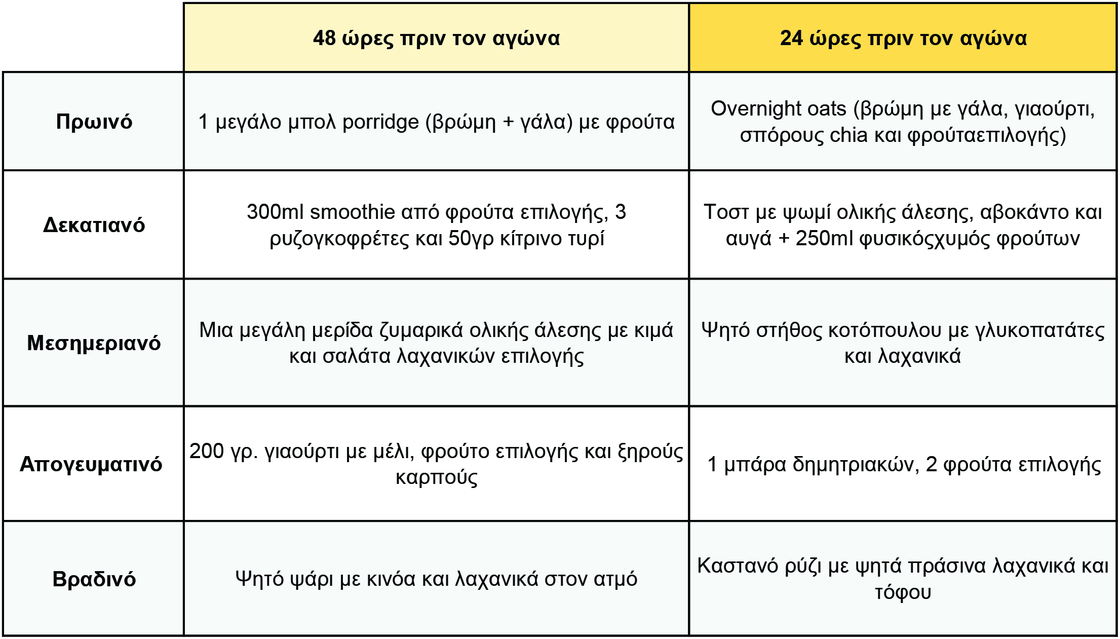 Επίλεξε κατά κύριο λόγο σύνθετους υδατάνθρακες όπως δημητριακά ολικής άλεσης, ζυμαρικά, ρύζι, βρώμη και πατάτες, καθώς παρέχουν σταθερή και παρατεταμένη ενέργεια, ιδανική για τη διαδικασία της φόρτωσης.