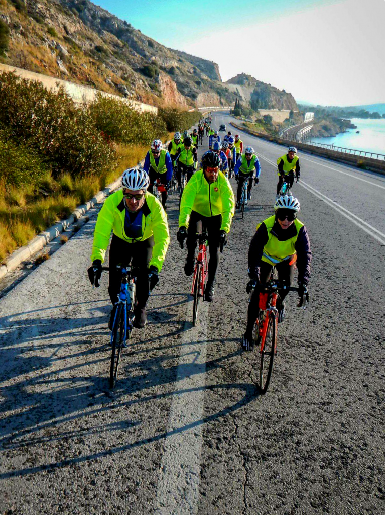 Δεν ξέρω που να κάνω φόκους για να περιγράψω τη διαδρομή μας πλάι στις ακτές του Σαρωνικού. Στα χρώματα του ουρανού; Στα αρώματα της χλωρίδας; Στα τεχνολογικά επιτεύγματα που «παίζουν» σε διαφορετικά επίπεδα; Πάνω ψηλά ο καινούριος δρόμος που μπανοβγαίνει στα τούνελ με τα ιστορικά ονόματα (γι’ αυτό που το ονόμασαν «Μαύρη Ώρα», δεν σχολιάζω, έλεος!). Πιο κάτω οι γραμμές του προαστιακού, πιο κάτω εμείς πάνω στον γραφικό παλιό δρόμο, και κάπου συναντιόμαστε με τις παλιές γραμμές του τρένου, που σε ανάγκαζε κάποτε να αφεθείς στην ομορφιά της φύσης, κάτι που εμάς τους ποδηλάτες μας χαρίζει ακόμη το υπομονετικό στροφάρισμα στα ανηφοροκατηφόρια. Τα νερά, στα δεξιά μας, κρυστάλλινα πρασινογαλάζια. Πώς την παλεύουν, αναρωτιέμαι, μ’ εκείνα τα θηρία τα πλοία εκεί πιο πέρα στον κοντινό ορίζοντα… Η δύναμη της φύσης που αντιστέκεται!