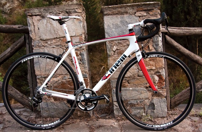 Το πλαίσιο του ποδηλάτου είναι φτιαγμένο εξολοκλήρου από ανθρακονήματα Columbus 30ΗΜ με το μέγεθος large το οποίο είναι αυτό της δοκιμής μας να μετρά 54 εκ. τον κάθετο σωλήνα του και 55 εκ. τον πραγματικό οριζόντιο. Η γεωμετρία του ποδηλάτου προσδιορίζεται από 73 μοίρες γωνία κούτελου και 73 μοίρες του κάθετου σωλήνα. Το ψηλό κούτελο του ποδήλατου διάστασης 16,5 εκατοστών φορά ποτήρια με το λογότυπο της Columbus και έχει ύψος 16,5 εκατοστών καθιστώντας το ποδήλατο φιλικό στις μεγάλες αποστάσεις, αφού μπορεί και προσφέρει μεγαλύτερη άνεση. Οι σωλήνες του πλαισίου διαθέτουν όπως όλα τα σύγχρονα πλαίσια διαφορετική διατομή με τον οριζόντιο σωλήνα να έχει πεπλατυσμένο σχήμα του οποίου η διατομή ελαττώνεται δραματικά σε σχέση με το σημείο συνάντησης με το κούτελο, γεγονός που δημιουργεί μία πολύ θετική εικόνα, καθώς το έντονο «νεύρο» του σωλήνα καθιστά σαφή την ποιότητα που διαθέτει ο σκελετός και παράλληλα του χαρίζει δυναμισμό. Η εναλλαγή αυτή στο σχήμα και τη διατομή του οριζόντιου σωλήνα επιτρέπει στο πλαίσιο να προσφέρει μεγάλη απορρόφηση κραδασμών. Το σημείο όπου τα seatstays συναντούν τον κάθετο σωλήνα επιτρέπει με τη σειρά του την προοδευτική μείωση κραδασμών, όπως αυτή καλείται από την Cinelli. Στο πλαίσιο θα βρούμε ποιοτικά ρυθμιστικά-ρεγουλατόρους για τα σύρματα των ταχυτήτων και βιδωτή βάση τύπου braze-on για το εμπρόσθιο ντεραγιέρ. Τα dropouts του πλαισίου είναι κατασκευασμένα με μέθοδο CNC. Το λευκό σε συνδυασμό με κόκκινο χρώμα του ποδηλάτου δημιουργούν ευχάριστη αντίθεση και συνδυάζεται επιτυχώς με τα λευκά περιφερειακά. Το πιρούνι του ποδηλάτου είναι επίσης κατασκευασμένο από ανθρακονήματα Columbus σε συνδυασμό με αλουμίνιο το οποίο χρησιμοποιείται στο λαιμό και στα «νύχια».