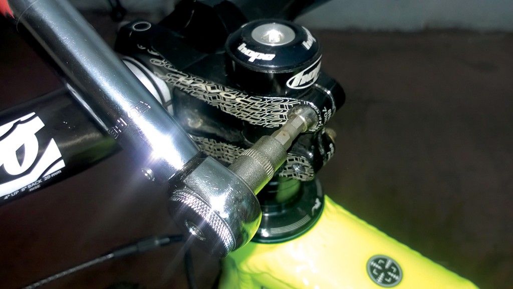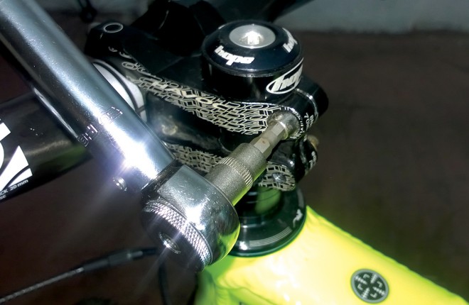 3. Αρχικά γρασάρουμε τις επιφάνειες έδρασης των ρουλεμάν στο κούτελο του πλαισίου και στο πιρούνι (βλέπε φωτό). Μετά τοποθετούμε το ένα ρουλεμάν στην βάση του πιρουνιού και περνάμε το πιρούνι στο κούτελο. Στην συνέχεια περνάμε το δεύτερο ρουλεμάν στον steerer tube του πιρουνιού και το πιέζουμε με το χέρι μέχρι να κάτσει στην θέση του. Κατόπιν τοποθετούμε την ειδική ροδέλα ασφαλείας, το καπάκι των ποτηριών και τις τυχόν αποστατικές ροδέλες. Εαν ο steerer tube του πιρουνιού είναι από υλικό carbon, πριν επανατοποθετήσουμε τον λαιμό, θα πρέπει να απλώσουμε στην επιφάνεια του “carbon paste”, για να μην στρίψει ο λαιμός κάτω από δυνατές οδηγικές πιέσεις. Τοποθετούμε λοιπόν τον λαιμό στο πιρούνι και βιδώνουμε αρχικά το καπάκι του με λίγη δύναμη για να “κάτσουν’’ καλά τα ποτήρια. Μετά ξεσφίγγουμε το καπάκι του λαιμού, και το ξανασφίγγουμε τόσο ώστε τα ρουλεμάν των ποτηριών να μην είναι πολύ σφιχτά αλλά και να μην παρουσιάζουν παίξιμο. Μολίς επιτύχουμε την κατάλληλη ρύθμιση, ευθυγραμμίζουμε τον λαιμό με τον τροχό και σφίγγουμε τις πλαϊνές του βίδες στην ροπή που αναφέρει ο κατασκευαστής (βλέπε φωτό). Φροντίζουμε να χρησιμοποιήσουμε ένα ροπόκλειδο ακριβείας – ιδίως σε carbon λαιμούς – και σφίγγουμε τις βίδες εναλλάξ, μία το πολύ στροφή την φορά.