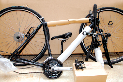 Ξεκινάμε: Βγάλτε τα πετάλια, τυλίξτε τα σε μία σακούλα και στην τσάντα ανταλλακτικών. Βγάλτε το παλουκόσελο μαζί με τη σέλα και βάλτε στην τσάντα. Μαζί βάλτε τον σφιγκτήρα του ή ασφαλίστε τον στο πλαίσιο. Βγάλτε την μπροστινή ρόδα και ξεφουσκώστε το λάστιχο. Βάλτε έναν αποστάτη στο πιρούνι. Ξεβιδώστε το πίσω ντεραγιέ και καλύψτε το με κάτι μαλακό ώστε να μη χτυπά στο σκελετό Βγάλτε την πίσω ρόδα και ξεφουσκώστε το λάστιχο. Τα quick release μπαίνουν στην τσάντα ανταλλακτικών. Αν το ποδήλατο έχει δισκόφρενα καλύψτε τους δίσκους και τοποθετήστε τους ειδικούς αποστάτες ανάμεσα στα τακάκια. Βάλτε έναν αποστάτη στο πλαίσιο. Αφαιρέστε το λαιμό του τιμονιού λύνοντας την κουκουνάρα και τις βίδες του λαιμού, ώστε να ελευθερωθεί το τιμόνι. Για να μη χάσετε την κουκουνάρα, βιδώστε ξανά στηθέση της. Το ποδήλατο έχει πλέον λυθεί και όλα τα ξεχωριστά κομμάτια βρίσκονται μέσα στην τσάντα ανταλλακτικών. Τώρα πρέπει να καλύψετε τους τροχούς, το σκελετό και το πιρούνι ώστε να μη γδαρθούν μεταξύ τους κατά το πακετάρισμα. Όταν βάζετε τα κομμάτια μέσα μην εφαρμόζετε δύναμη για να σφηνώσουν γιατί σίγουρα θα γίνει ζημιά. Αποστάτες για το πιρούνι, το πλαίσιο και τα τακάκια των δισκόφρενων υπάρχουν μέσα σε κάθε καινούργια συσκευασία των ανταλλακτικών. Αν δεν έχετε ζητήστε εγκαίρως από το μαγαζί που θα πάρετε την κούτα να σας κρατήσουν. Τέλος μην ξεχάσετε να γράψετε το όνομα και τα στοιχεία σας πάνω στο κιβώτιο. Μπας και γίνει τίποτα περίεργο…_