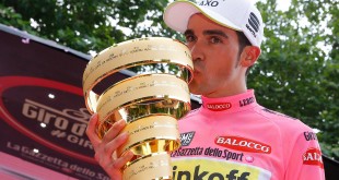 O Πιστολέρο Alberto Contador ( Tinkoff Saxo) φεύγει από το Μιλάνο με το Trofeo Senza Fine που του παρέδωσε η Cristina Chiabotto έχοντας καταφέρει κατά το ήμισυ το στόχο της νίκης των δύο μεγάλων Γύρων -όπως είχε καταφέρει ο Πειρατής Marco Pantani το 1998-