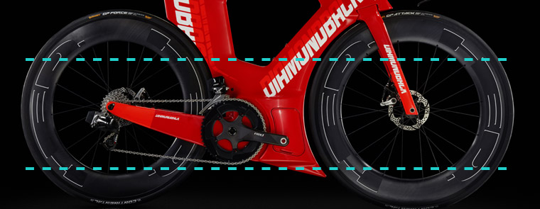 Η πρώτη ήταν η ενσωμάτωση των τροχών με το πλαίσιο. Μία μεγάλη πρόκληση καθώς οι κατασκευαστές τροχών δεν χρησιμοποιούν συγκεκριμένα στάνταρ στη σχεδίαση (προφίλ, φάρδος κλπ.). Για τις δοκιμές χρησιμοποιήθηκαν τροχοί της HED. Η σχεδίαση του πλαισίου έχει γίνει με τη φιλοσοφία Aero Core, η οποία συνδέει τους δύο τροχούς με ένα μεγάλο πτερύγιο που ξεκινάει από τον εμπρόσθιο τροχό, μεταφέρεται στην περιοχή της μεσαίας τριβής και καταλήγει στον οπίσθιο τροχό, με αποτέλεσμα τη σημαντική βελτίωση της ροής του αέρα σε ολόκληρο το ποδήλατο.