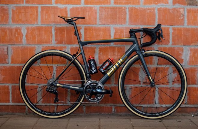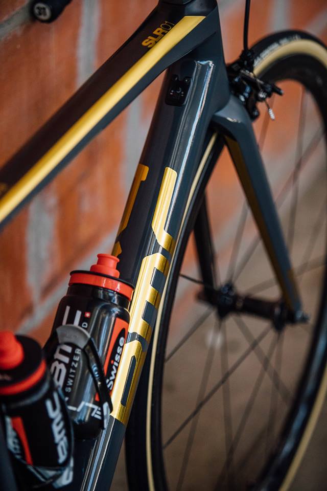Η ελβετική εταιρεία BMC, θέλοντας ο Van Avermaet να έχει ξεχωριστή παρουσία μέσα στην ομάδα και στο πελοτόν, επίλεξε αντί του κόκκινου που είναι το βασικό χρώμα της ομάδας, να βάψει το πλαίσιο με ένα σκούρο μεταλλικό γκρι που, σε συνδυασμό με τα χρυσά γραφικά και τις χρυσές λεπτομέρειες, δημιουργεί ένα εντυπωσιακό και ξεχωριστό αποτέλεσμα.