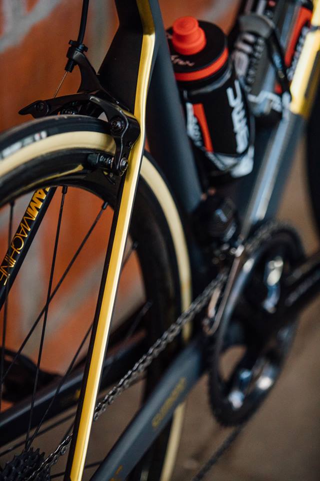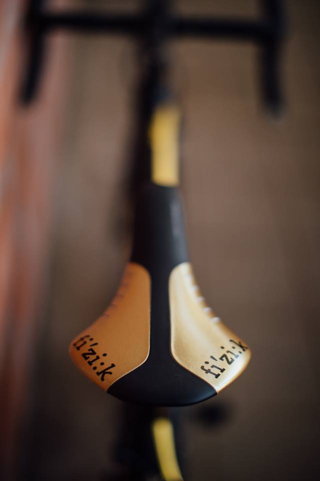 Οι χρυσές λεπτομέρειες εκτείνονται και στη σέλα του ποδηλάτου που δεν είναι άλλη από την Antares της Fizik.