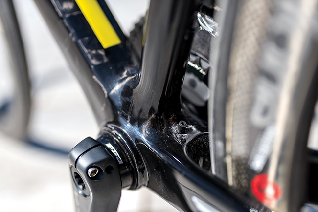 Άλλο ένα χαρακτηριστικό του 765 που μου έκανε εντύπωση και με ευχαρίστησε ιδιαίτερα, ήταν η επιλογή του compact δισκοβραχίονα 50-34t, σε συνδυασμό με την κασέτα 11-32! Ένα πάτημα που ταίριαζε απόλυτα στο χαρακτήρα του ποδηλάτου και που εκτός του ότι είχα πάντα μια έξτρα ταχύτητα στις ανηφόρες για να στροφάρω (όταν η κλίση γινότανε διψήφια), μπορούσα να κρατήσω πιο εύκολα και το μεγάλο δίσκο για μεγαλύτερο χρονικό διάστημα. Μιλώντας για ανηφόρες, η απόδοση του 765 ήταν θετική, με ικανοποιητικά επίπεδα ακαμψίας από τη μεσαία τριβή και το ασύμμετρο οπίσθιο τρίγωνο, που μετέφεραν ομαλά τη δύναμη στο δρόμο. Αν κάπου το ποδήλατο ένιωθε έξω από τα νερά του ήταν στα όρθια σπριντ πάνω από τα 1000 watt, εξαιτίας κυρίως της γεωμετρίας και του πολύ «ψηλού» headtube.
