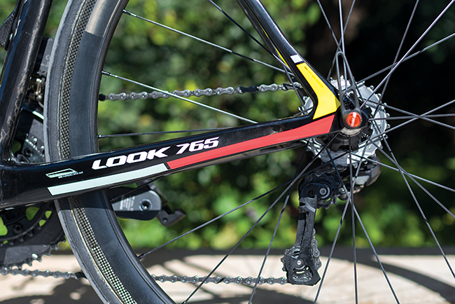 To Look 765 της δοκιμής κατέφθασε στα χέρια μας από τα κεντρικά της γαλλικής εταιρείας στο Nevers, στην κορυφαία του έκδοση, βαμμένο στα χρώματα PROTEAM και εξοπλισμένο με την εξαιρετική ηλεκτρονική σειρά Ultegra Di2 της Shimano. Aυτό που μας εξέπληξε ήταν το επιλεγμένο πάτημα του ποδηλάτου με compact δισκοβραχίονα 50-34t και κασέτα 11-32t! Το cockpit ήταν της FSA, με λαιμό Omega στα 110mm και αλουμινίου τιμόνι Vero Compact 40mm c-c. Tης ίδιας εταιρείας ήταν και το παλουκόσελο Gossamer 27.2mm. H σέλα ήταν η αρκετά αναπαυτική Selle Italia Flow και οι τροχοί οι αλουμινίου Mavic Aksium με 25άρια ελαστικά Continental Ultra Sport II. Εδώ θα πρέπει να αναφέρουμε πως για την καλύτερη αξιολόγηση των δυνατοτήτων του πλαισίου, στο μεγαλύτερο διάστημα των δοκιμών χρησιμοποιήσαμε τους κορυφαίους τροχούς Industry Nine C41 Tubular με ελαστικά Michelin PRO4 Service Course Tubular 23c. Τέλος τα πετάλια δεν θα μπορούσαν να ήταν άλλα από τα Look ΚΕΟ ΒLADE 2 CR.