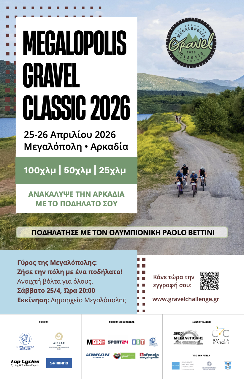 Στο πλαίσιο του 2ου Megalopolis Gravel Classic 2026, η εβδομάδα είναι αφιερωμένη στο ποδήλατο! Μαθήματα σε σχολεία, εκδηλώσεις, Bike Expo αλλά και ποδηλατικός γύρος της πόλης, όλα με την ταυτόχρονη παρουσία ενός χρυσού Ολυμπιονίκη, του «θρύλου» Paolo Bettini στην Μεγαλόπολη.Ας δούμε πιο αναλυτικά το πρόγραμμα και τις εκδηλώσεις του Megalopolis Gravel Classic 2026: