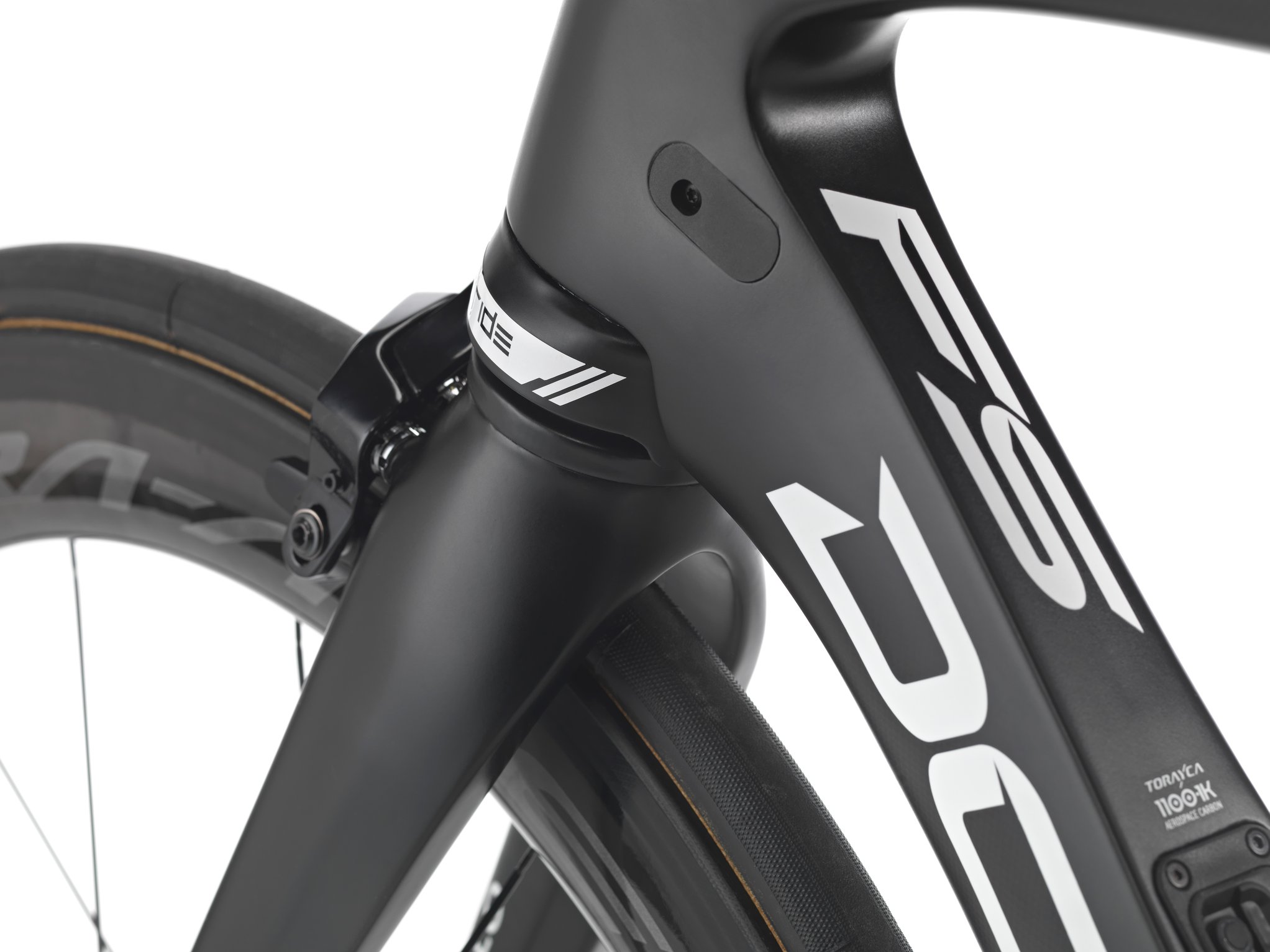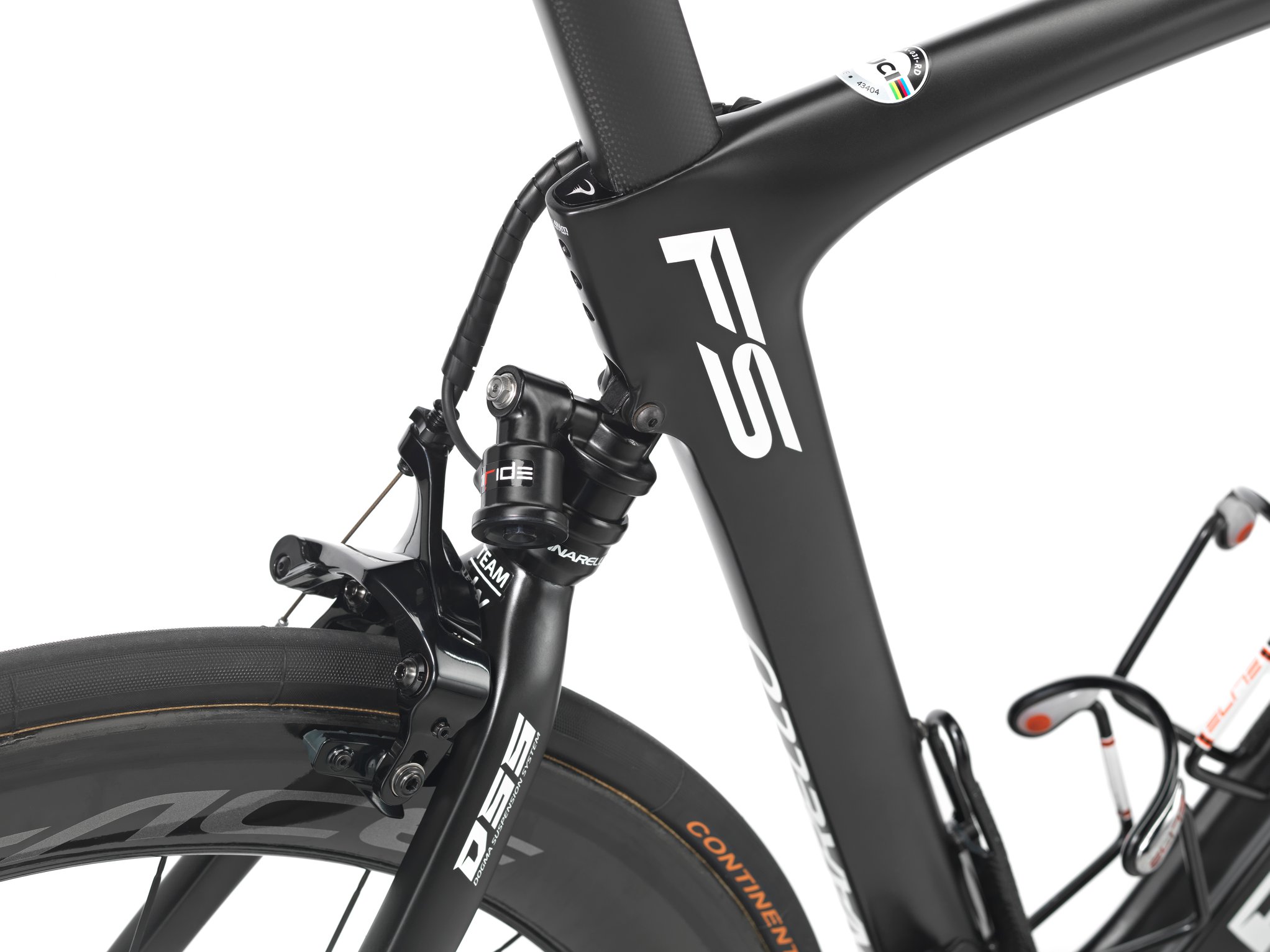 Ο πυρήνας της απορρόφησης των κραδασμών της εμπρόσθιας ανάρτησης είναι ένα ελατήριο μεταλλικού πηνίου. Ολόκληρο το σύστημα ενσωματώνεται στο εσωτερικό του head tube. Η απόσβεση παρέχεται από ένα υδραυλικό σύστημα, το οποίο επιτρέπει στην ανάρτηση να αλλάζει ηλεκτρονικά την κατάστασή της και να ξεκλειδώνει, να αξιοποιεί πλήρως τη διαδρομή των 20 χιλιοστών και να κλειδώνει όταν το απαιτούμενο είναι η ακαμψία και η απόλυτη μεταφορά της παραγόμενης δύναμης (λέτε ο Luke Rowe να χρειαστεί να σπριντάρει στο velodrome του Roubaix;)