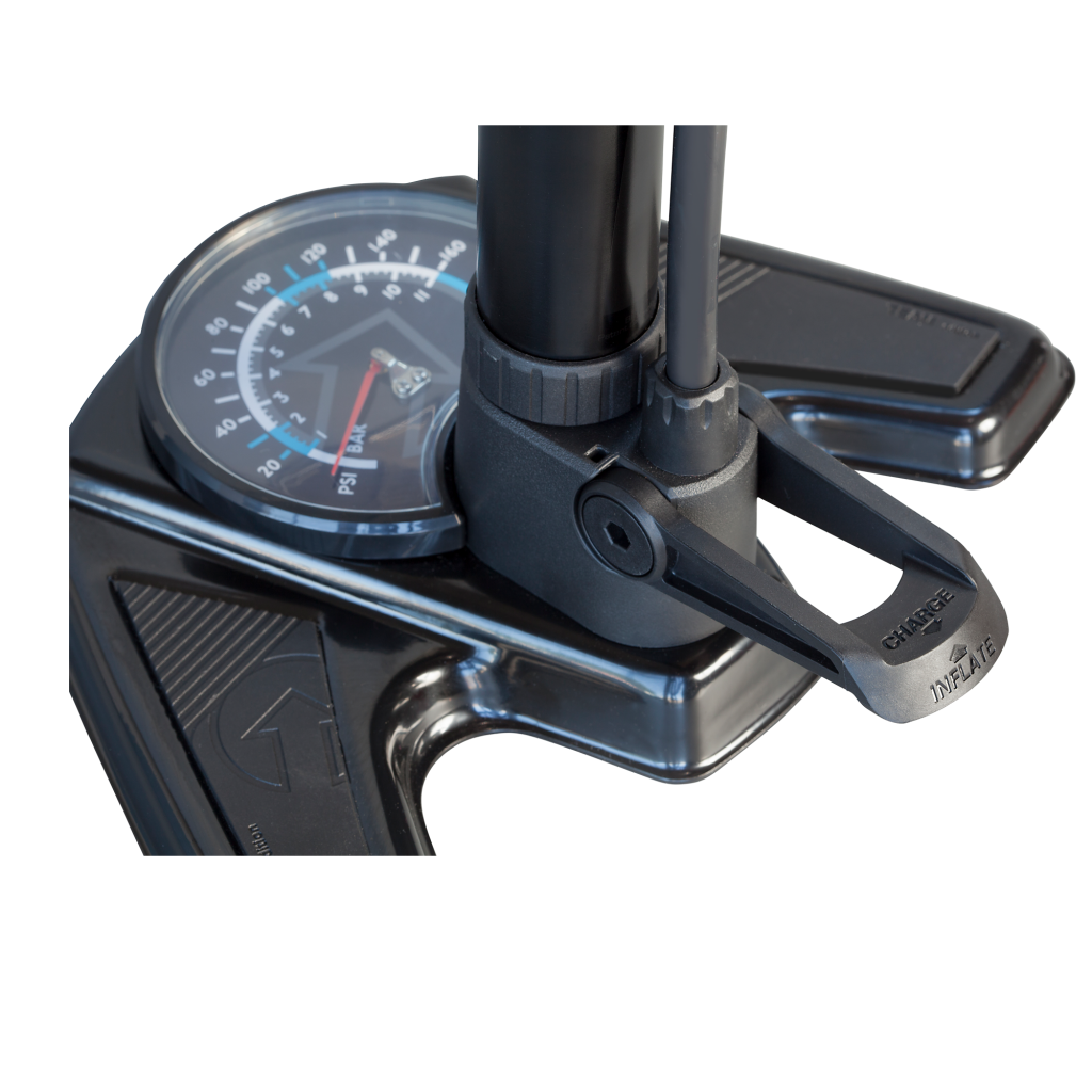 Πιέζοντας τη χειρολαβή της τρόμπας κανονικά, σαν να φουσκώνουμε, ο θάλαμος φορτίζεται με συμπιεσμένο αέρα – έως και 160psi. Μόλις φορτίσουμε τον θάλαμο με την απαιτούμενη ποσότητα αέρα, τοποθετούμε την κεφαλή στην βαλβίδα tubeless του τροχού και την ασφαλίζουμε.